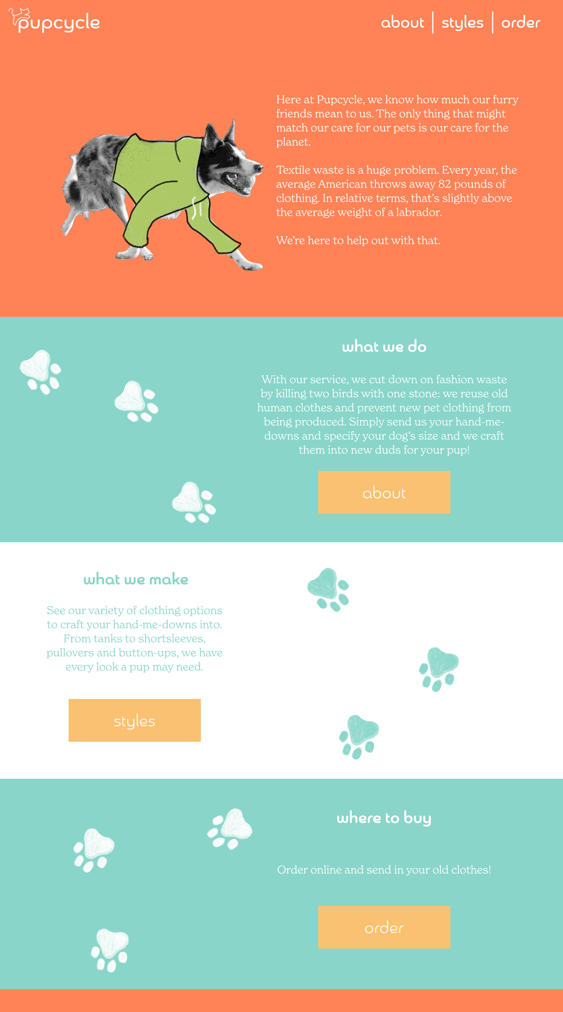 Do you want to doll up your dog and help the environment at the same time? Have your clothes tail-ored to your furry friend! This branding treatment for a fictional company includes logo, package, and advertisement design, featuring fun colors and simple illustrations over black-and-white pet photography. Also included in this brand development is a pop-up dog park re-tail location selling custom merchandise such as totes and dog bowls, along with website and app mockups.